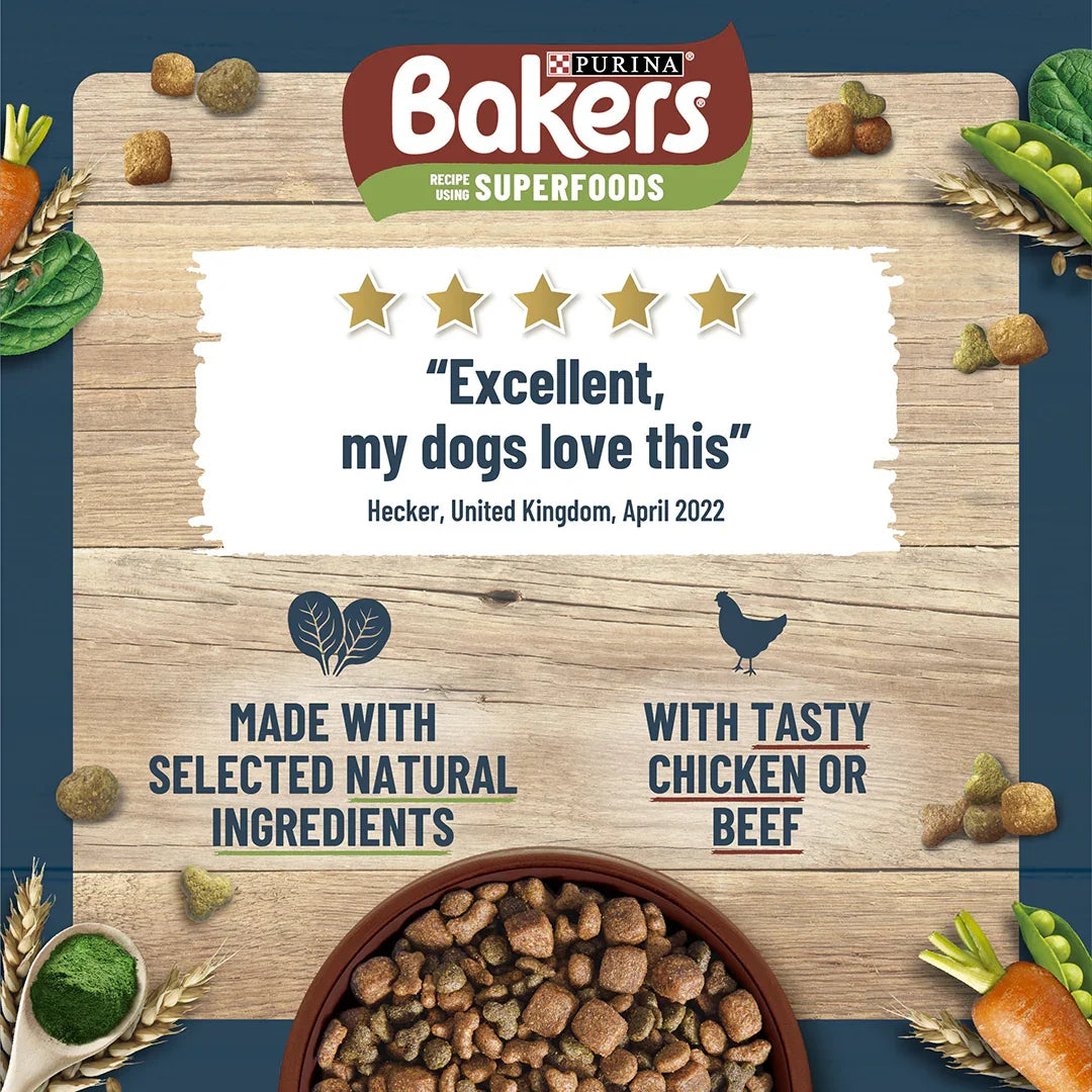 Our recipe is meticulously crafted, featuring a delightful array of tender* meaty chunks and wholesome whole grains, meticulously chosen to deliver a remarkable blend of superior quality and mouthwatering satisfaction. Each meal is enriched with the essential daily nutrients necessary to support the playful and mischievous antics that characterize the joyful and healthy lives of contented BAKERS dogs!