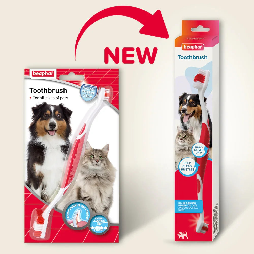 This versatile toothbrush includes two heads—one small, one large—to reach all areas of your pet's mouth, promoting thorough plaque and tartar removal . Its design helps.