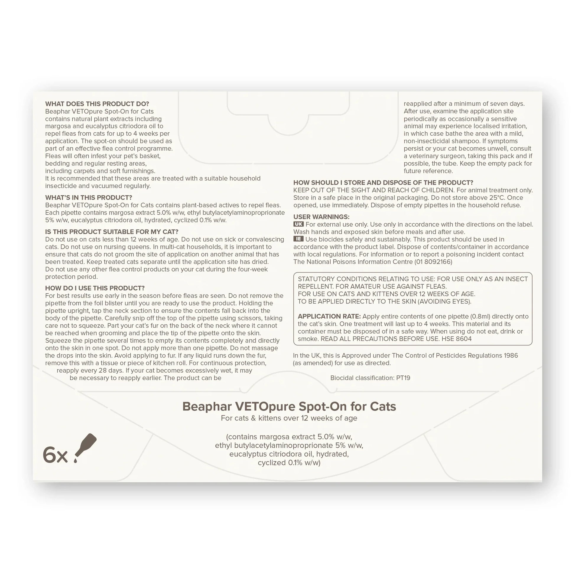 Beaphar VETOpure Flea Spot-On Repellent for Cats contains natural plant extracts including margosa and eucalyptus citriodora oil to repel fleas from cats for up to 4 weeks per application.