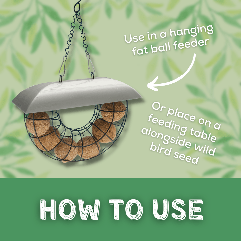 You can hang them using the included net, or for a safer feeding option, remove the net and place the fat ball in a dedicated fat ball feeder. Hang the feeder in a location where you can enjoy watching wild birds feed while ensuring there is an abundant supply of fresh, clean water available.