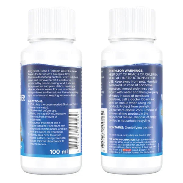 King British Turtle & Terrapin Water Freshener uses beneficial denitrifying bacteria to break down harmful ammonia and nitrite produced by food waste and turtle excrement. It helps maintain clean, clear water in tanks and terrariums.