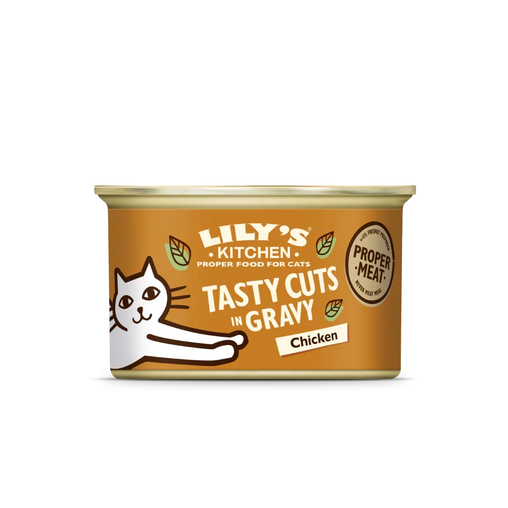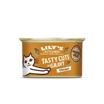 Treat your feline friend to a delicious and wholesome meal with Lily's Kitchen Tasty Cuts in Gravy with Chicken. Made with 40% freshly prepared chicken and 13% pork, this tasty recipe is gently cooked and served in a savoury gravy that cats love. Each tin contains a nutritionally complete meal made from natural ingredients — no artificial additives, fillers, or added sugars.