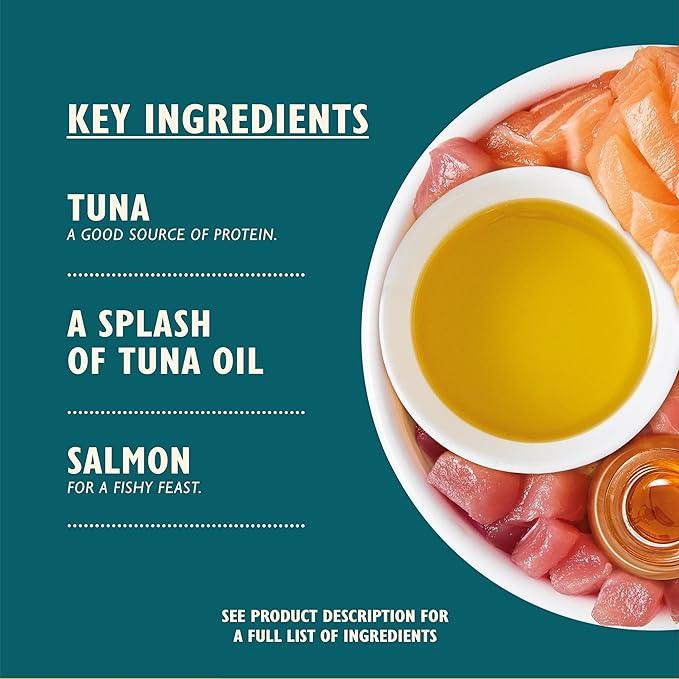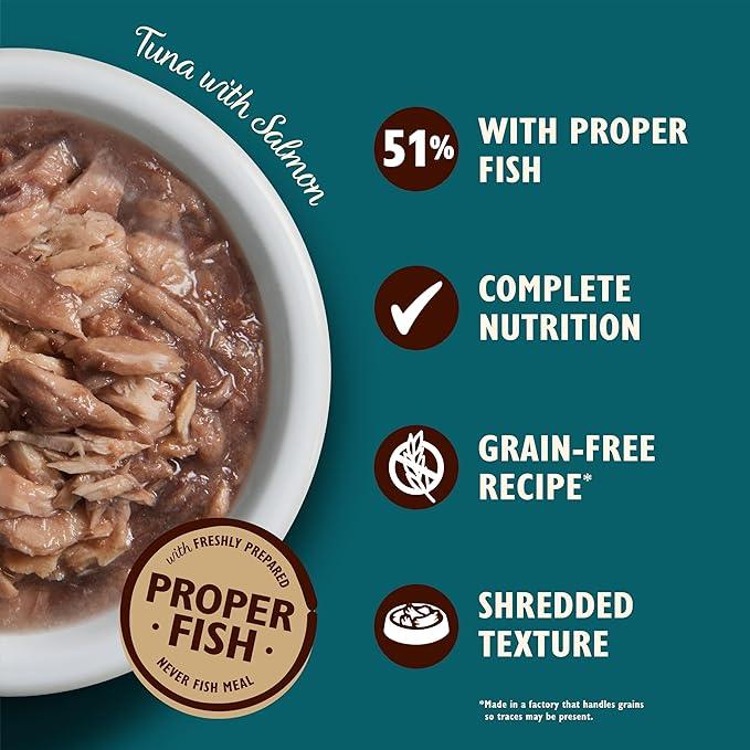 Tuna with Salmon. This is a nutritionally complete pet food for adult cats from 4 months+. What’s up, kitty cat? We’ve made the rulers of your household a wet cat food recipe they’ll appreciate, with shredded tuna and salmon fillets, nestled in a seriously delicious broth. The best part about it is it's made with natural ingredients, no added sugar, and of course, no added grains. It’s also complete, which means it has absolutely everything your moggy needs. Does it get any better than this? Answer: no.
