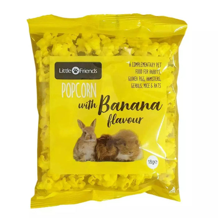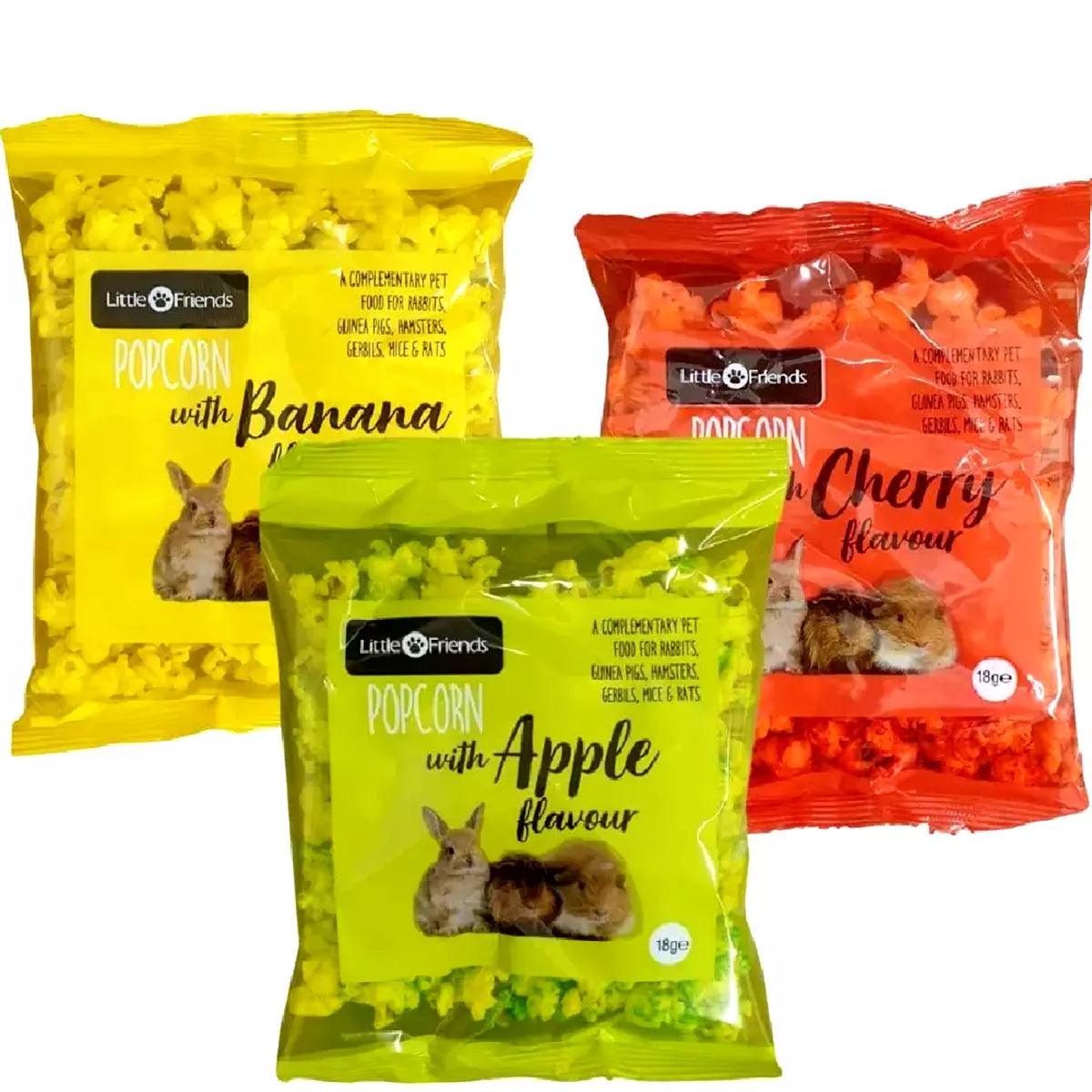 Little Friends Small Animal Popcorn is a fun and tasty treat specially designed for small pets such as rabbits, guinea pigs, hamsters, and other rodents. This pack contains three individual bags of flavoured popcorn in delicious banana, cherry, and apple varieties — perfect for adding a bit of variety to your pet's snack time.