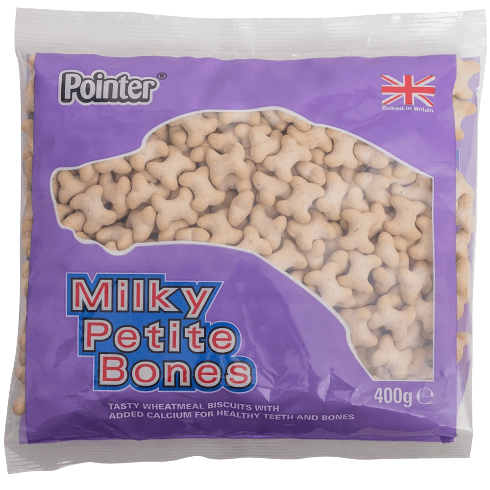 Pointer Milky Petite Bones are delicious wheatmeal dog biscuits enriched with calcium to support healthy teeth and bones.