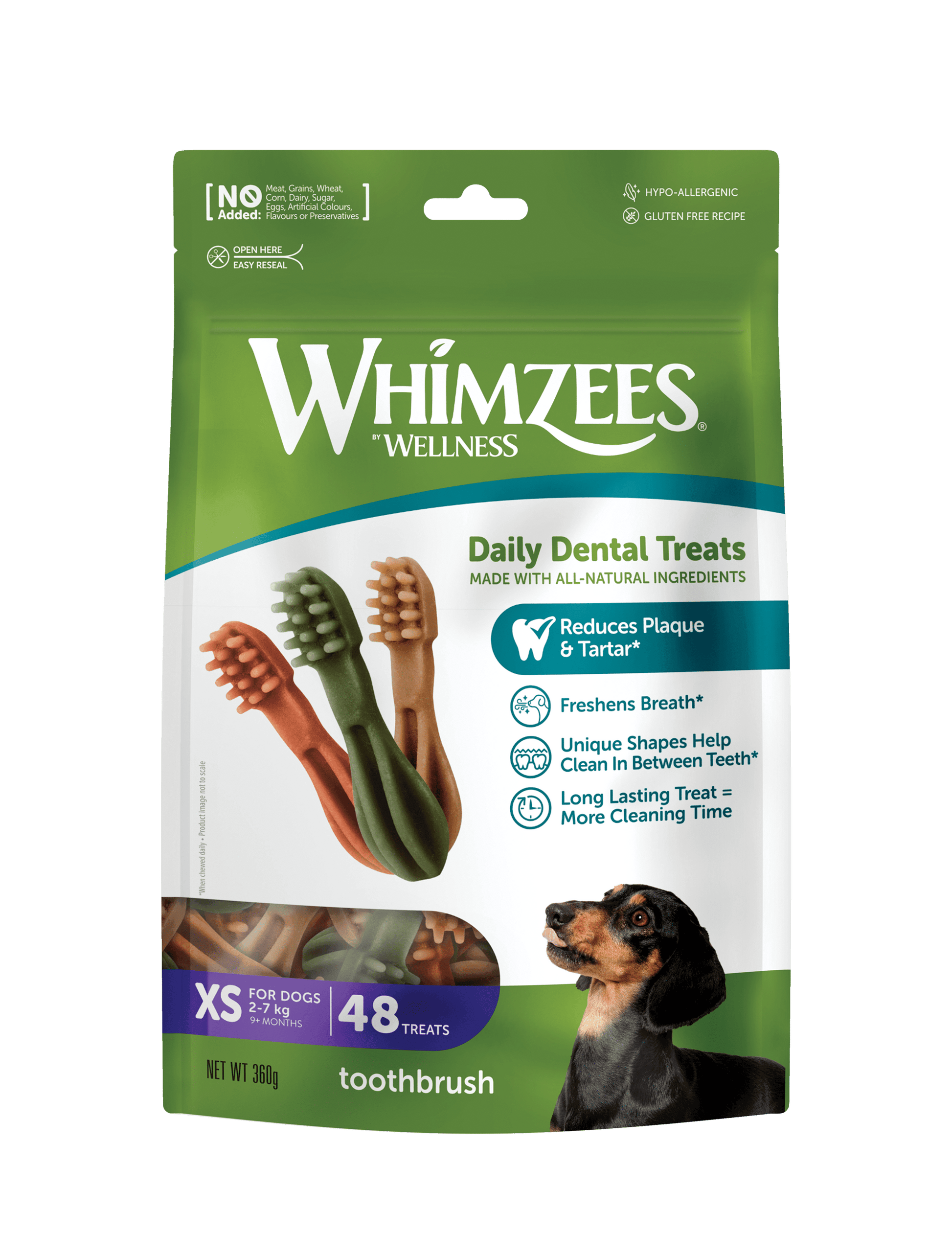 Welcome your extra small dogs weighing 2-7kg to a delightful "brushing" experience with the fun shape of WHIMZEES Toothbrush Daily Dental Dog Chews.