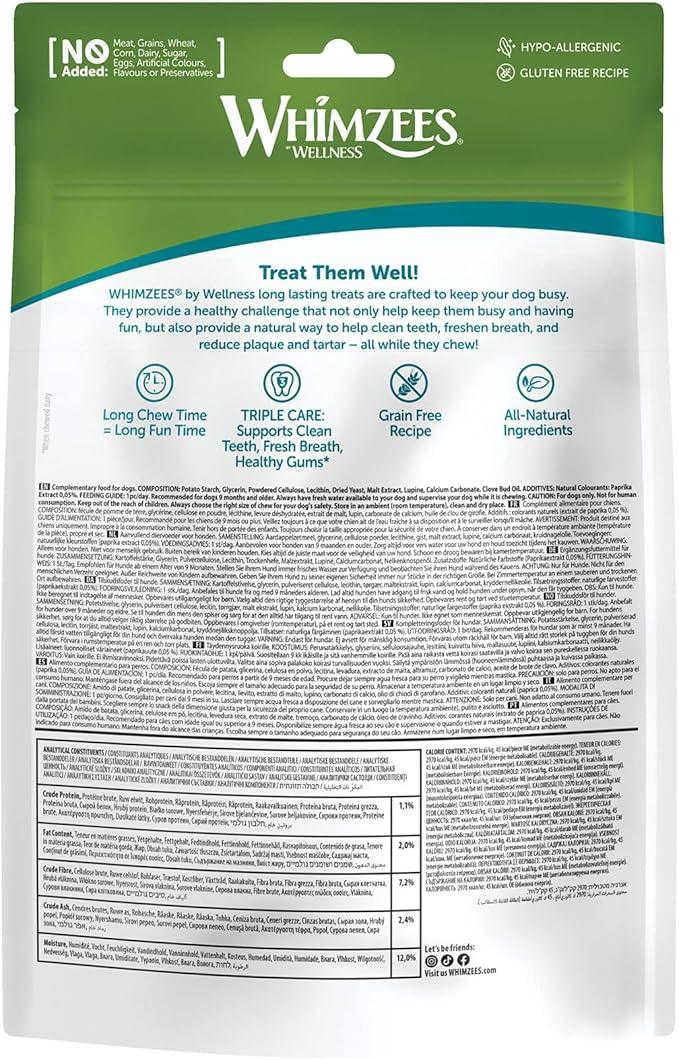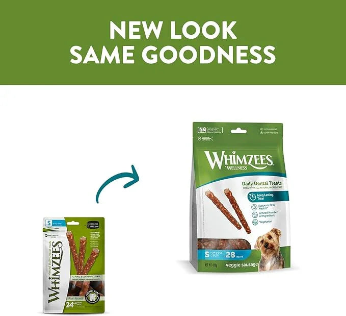 Whimzees Veggie Sausages are natural, daily dental chews designed for small dogs. Made with plant-based ingredients, they help reduce plaque and tartar as your dog chews. Their firm texture and unique shape promote longer chewing time, which supports clean teeth and fresh breath. These chews are low in fat, high in fiber, and contain no artificial additives or preservatives.