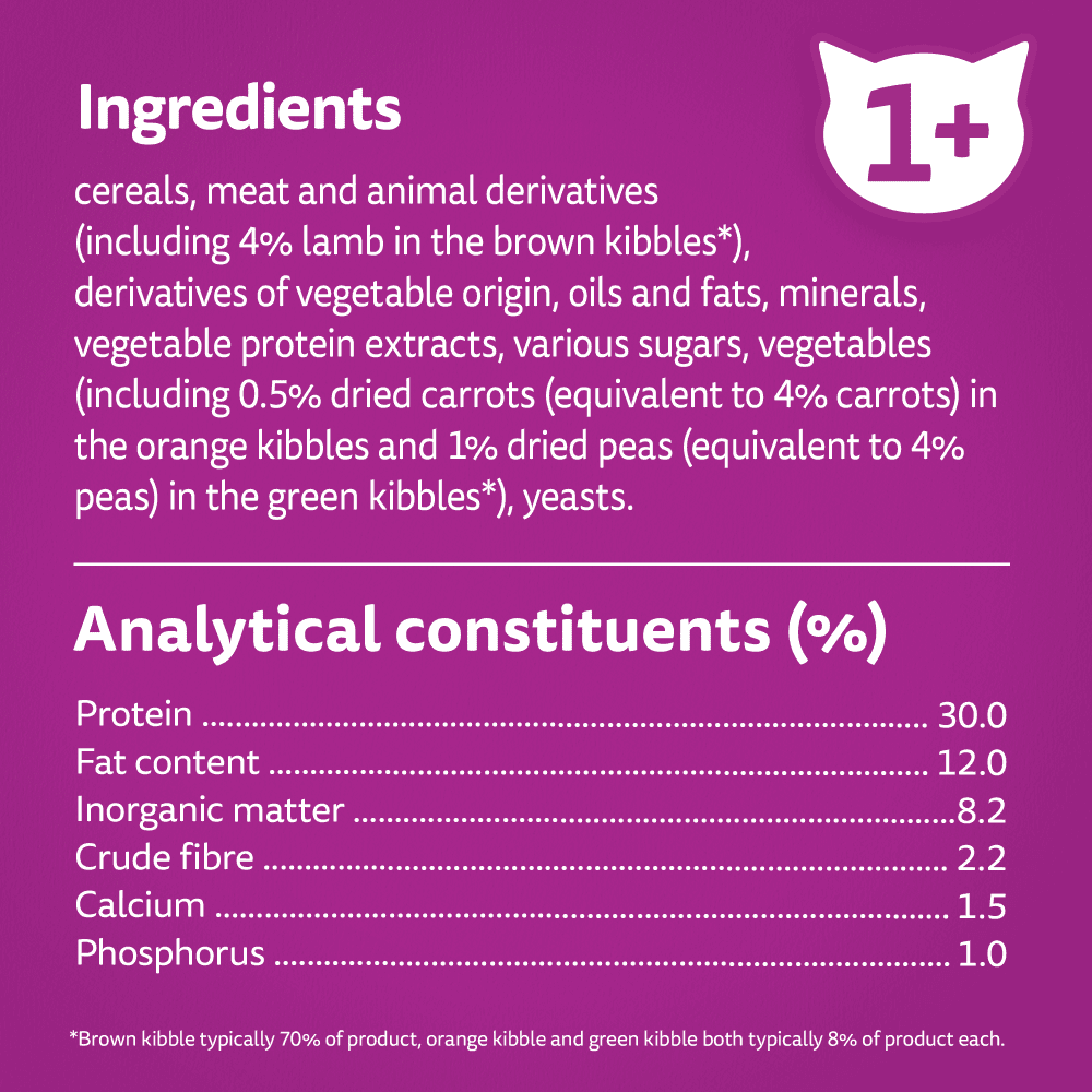 Whiskas 1+ Adult with Lamb Dry Cat Food, in a 1.9kg bag, is specially formulated to meet the nutritional needs of adult cats. Made with tender lamb as the primary ingredient, it provides a delicious and protein-rich meal that supports overall health and well-being.