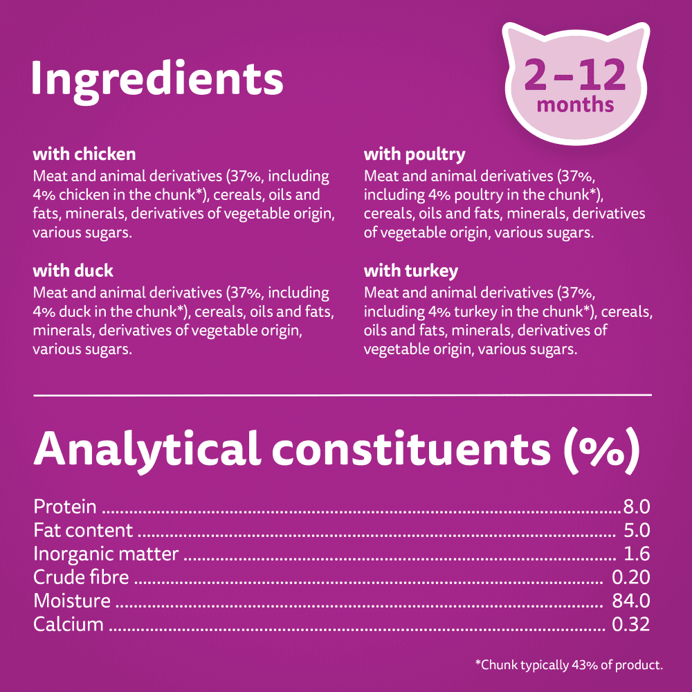 WHISKAS® Kitten Poultry Feasts in jelly are meticulously crafted to lock in the natural goodness and taste of high-quality ingredients, ensuring your kitten hurries to their meal with enthusiasm. Each 85g pouch is specifically designed to support your kitten's growth and health during their critical first year, from 2 to 12 months old.